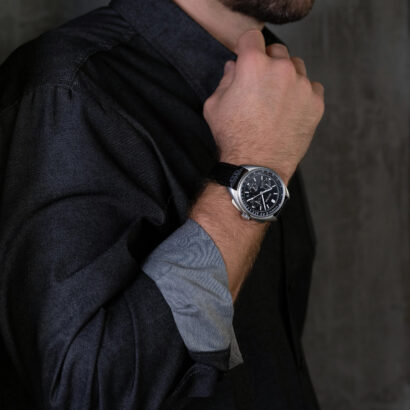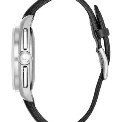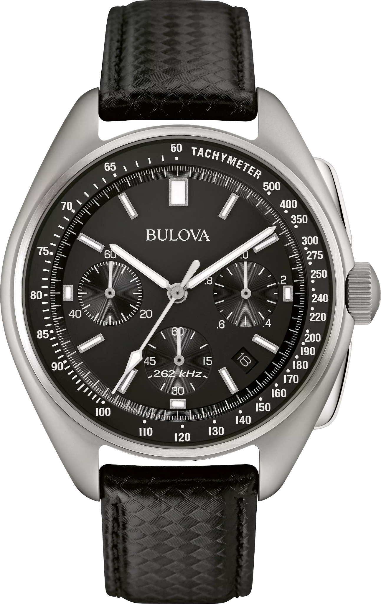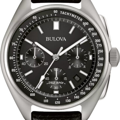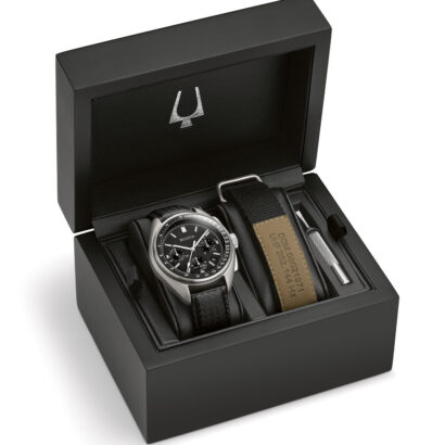 Bulova made space history on August 2, 1971–during the Apollo 15 mission, a moon pilot chronograph, customized for lunar conditions by Bulova engineers, was worn on the moon. Now Bulova makes history again with the special edition Lunar Pilot Chronograph, updated with our exclusive high performance quartz movement with a frequency of 262 kHz for unparalleled accuracy, continuing a history of precision timing. Features include super-luminous hands and markers, anti-reflective sapphire glass, tachymeter and calendar all housed in a sandblasted solid 316L surgical-grade stainless steel case in silver-tone with black dial. Two interchangeable straps are included — one a textured black leather; the other, a black nylon with a nubuck leather patch that commemorates the date of mission (DOM) as 08021971. Gift-box presentation includes a Certificate of Authenticity.