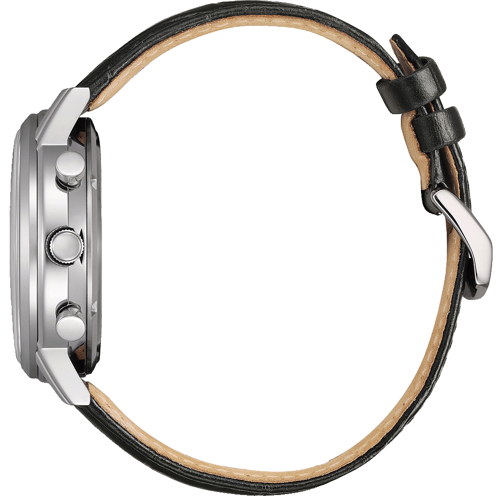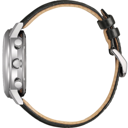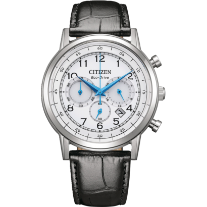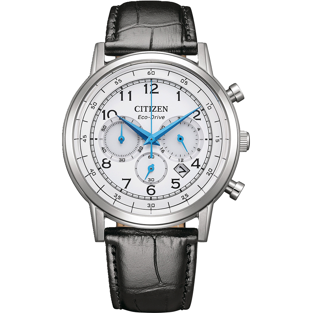 The Citizen CA4630-02A is a stylish men’s watch with a 42mm stainless steel case, a white dial with easy-to-read numbers, and a black leather strap.