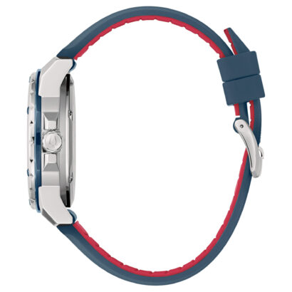 •Blue silicone strap with contrasting red underside; flat mineral crystal; water-resistant to 200 m  .