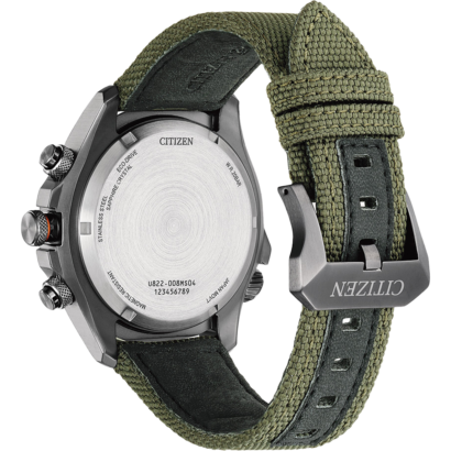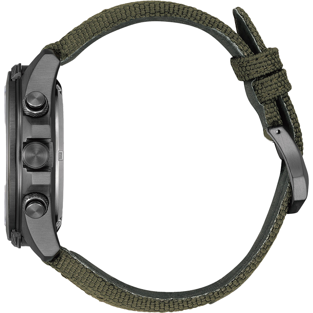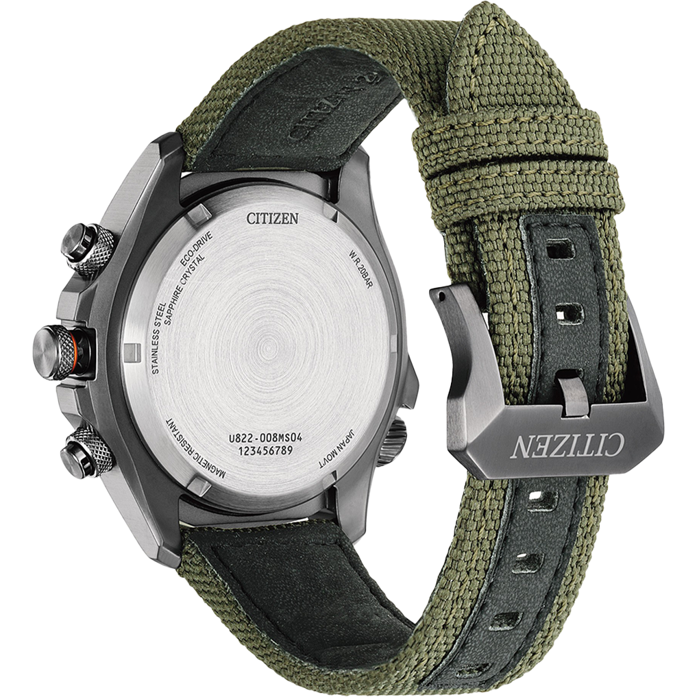 The watch’s advanced capabilities include a world time display, chronograph, alarm, light level indicator, perpetual calendar, power save mode, charge level display, and summertime mode. The Promaster Land is sustainably powered by any light with our proprietary Eco-Drive technology, so it never needs a battery. Water resistant up to 200 meters. Caliber U822.