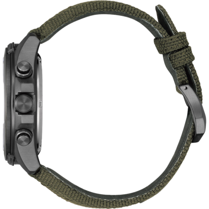 On the dial, luminous hands and markers stand out against a forest green background for high legibility, while a rotating compass scale surrounds the look, and the digital-analog display ensures complete focus on the mission.