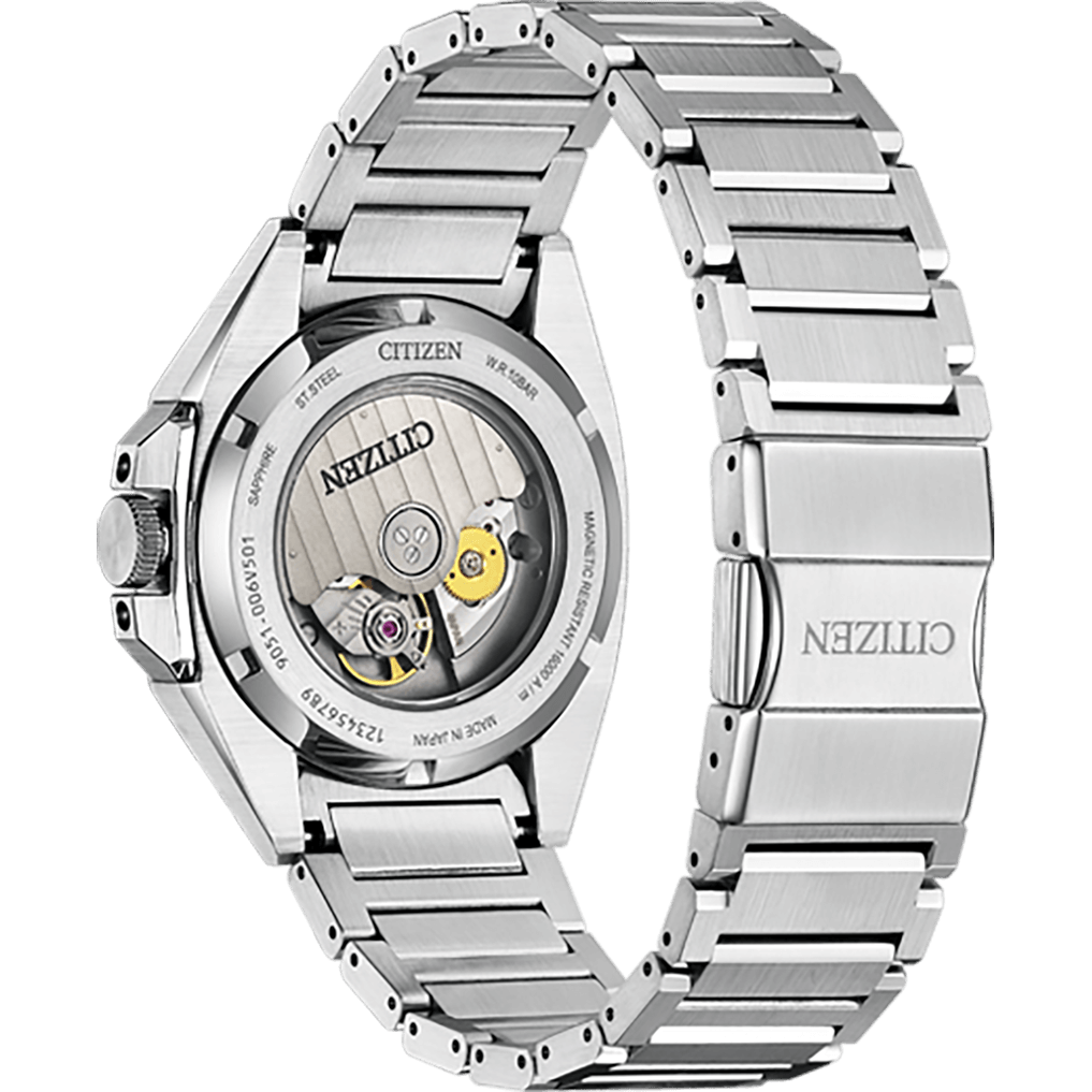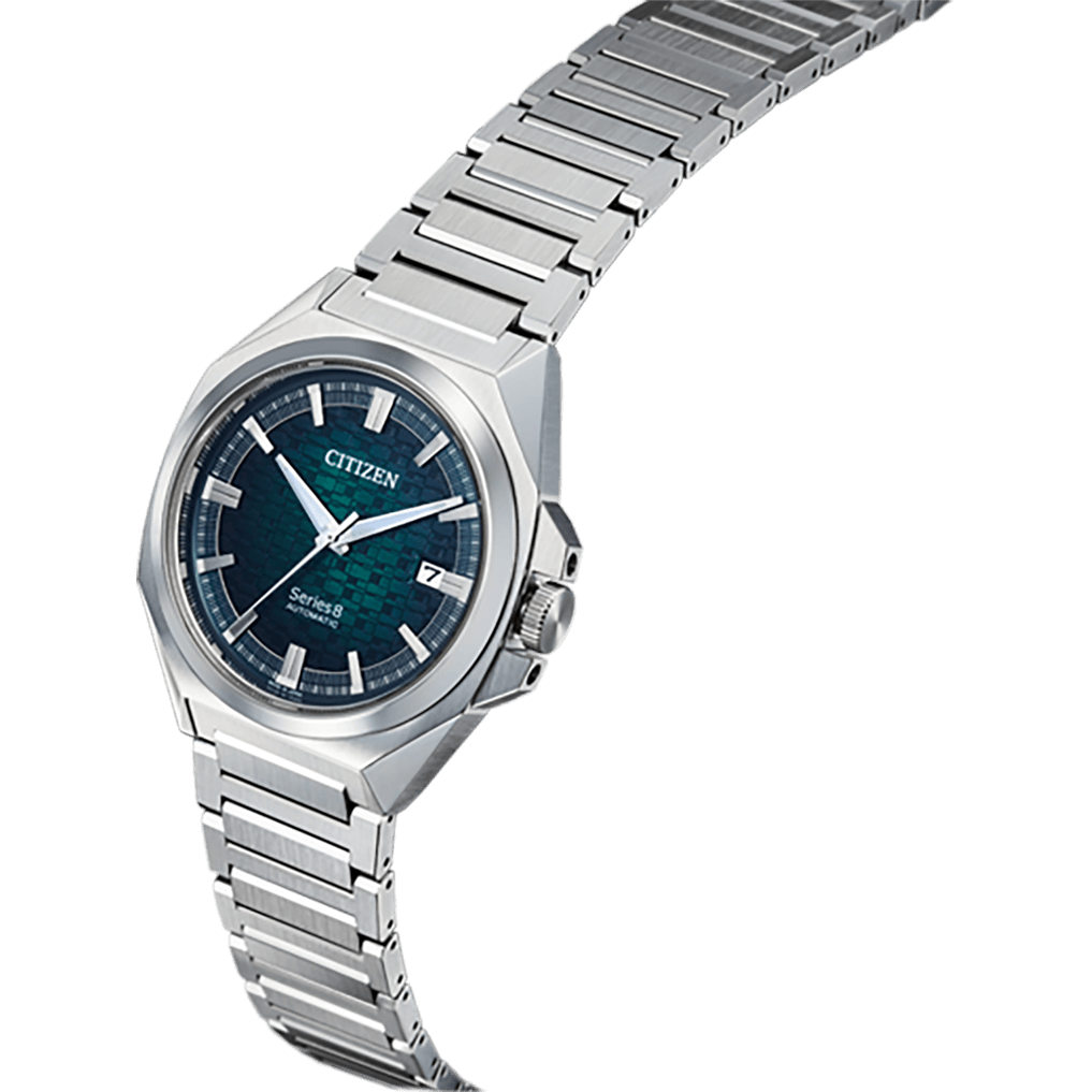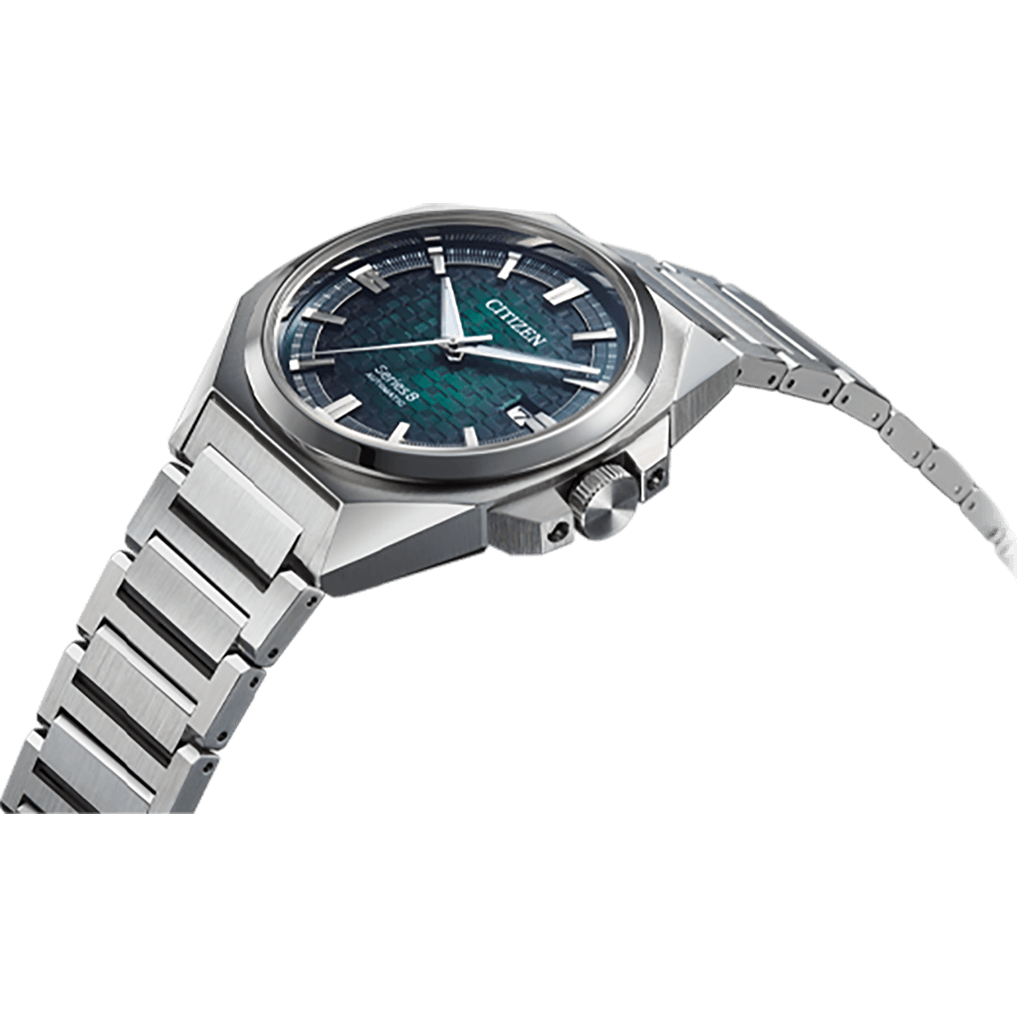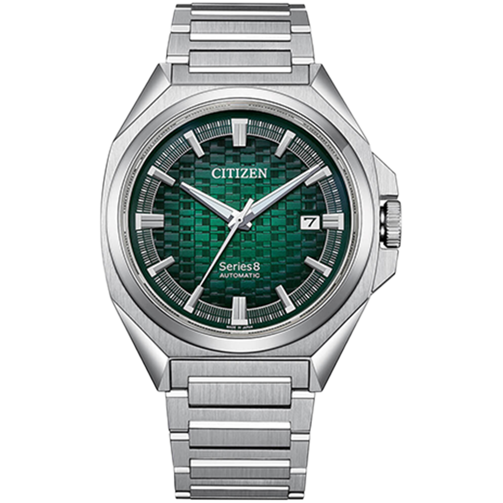 The NB6050-51W from the Series 8 collection is an eye-catching automatic watch with a structured dial. The case and bracelet are made of stainless steel, while the anti-reflective sapphire glass allows a clear view of the green dial. The illuminated hands and folded indices are easy to read in all lighting conditions.