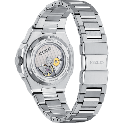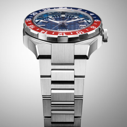 The automatic GMT movement is visible through a sapphire exhibition case back and is capable of maintaining an accuracy of +20 / -10 seconds per day with a frequency of 28,800 v/h and a power reserve of 50 hours. A tapered, integrated silver-tone stainless steel H-link bracelet secures the watch to the wrist, with its design following the aesthetic of the case via the use of polished and brushed facets.