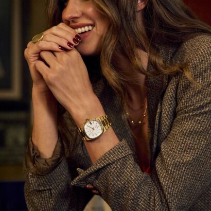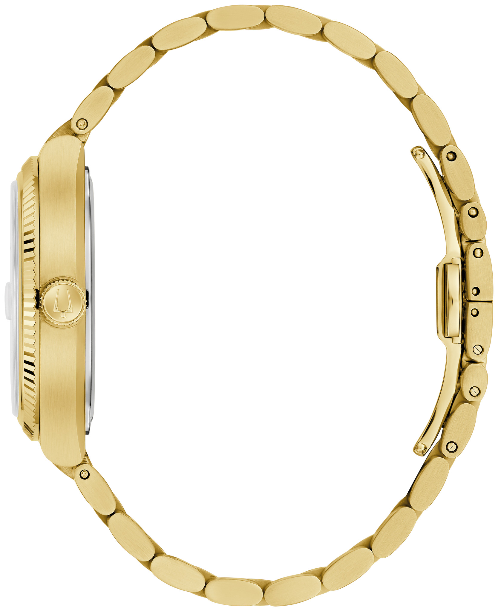 The gold-tone stainless steel 38mm case has the versatility to be worn by most anyone and makes a bold statement with a seamless silhouette created by the retro TV-shaped case transitioning into the integrated 3-link stainless steel bracelet, which features a secure and convenient push-button deployant clasp.