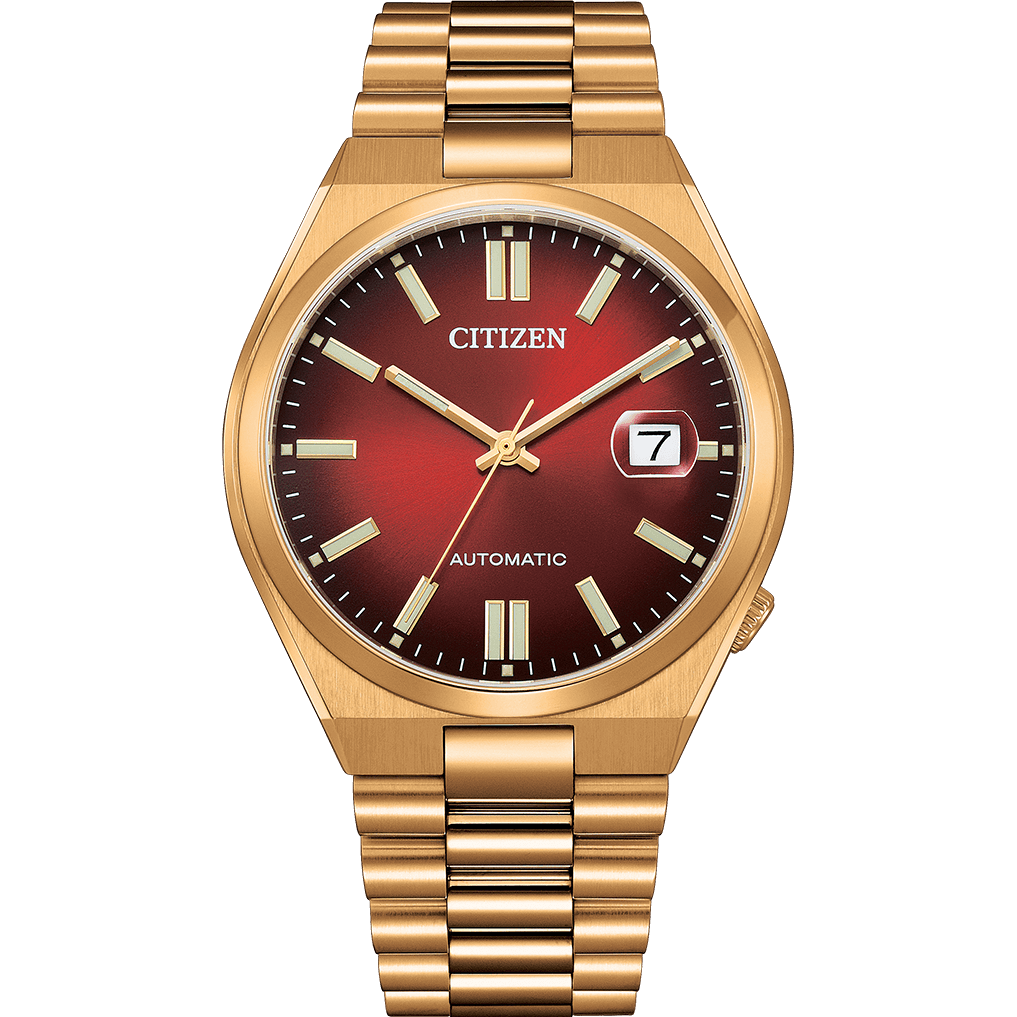 Minimal, modern and unpretentious. This mechanical watch from the NJ015 series powered by CITIZEN’s 8210 movement combines a strong and stylish appearance designed for today’s lifestyle. The watch features a rose gold plated solid stainless steel case and bracelet with a vibrant scarlet red dial and a date display encased in a sapphire crystal with a date magnifier and also has a skeleton case back showcasing the movement of the watch.
