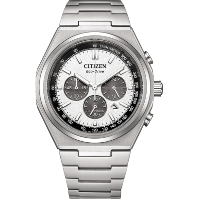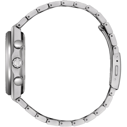 Featuring a 42.4mm silver-tone Super Titanium™ case paired with stylish stepped chronograph pushers and a stylized crown, the finely brushed and polished timepiece is secured to the wrist with a matching integrated bracelet.
